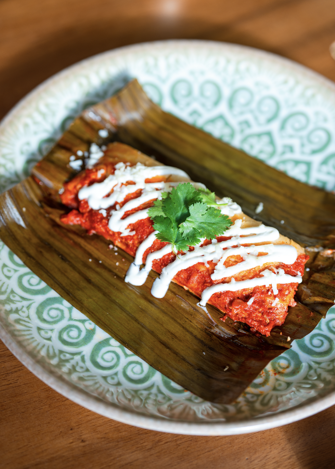 Seasoned corn masa filled with shredded pork in a rich guajillo salsa, wrapped in banana leaves and steamed. Topped with crema, queso fresco, and fresh cilantro. Available individually or in a 6 family pack