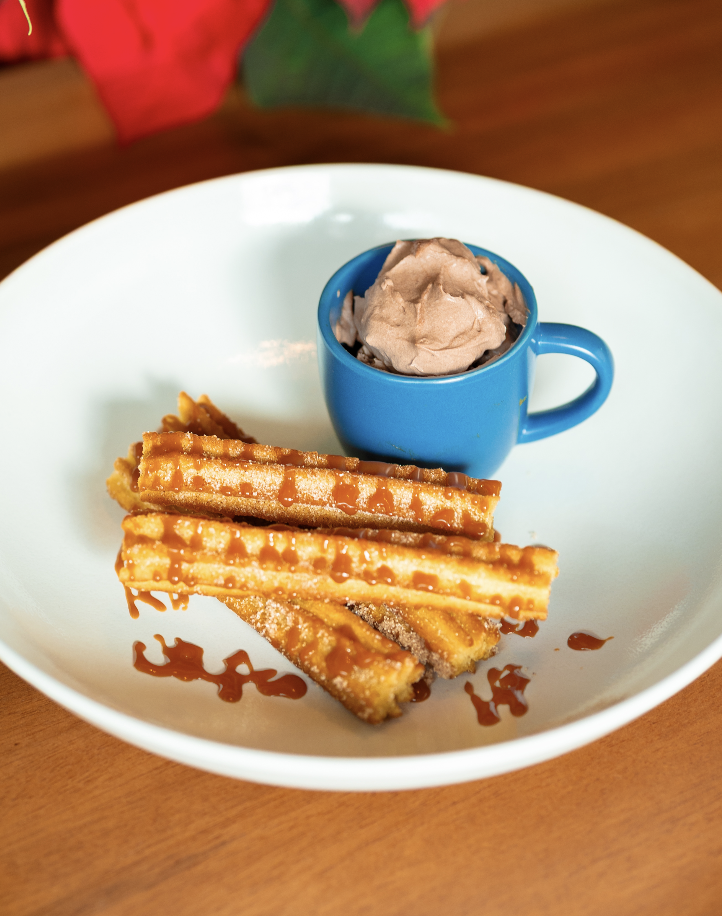 Four 5-inch churros, crispy fried pastry rolled in cinnamon sugar. Served with a small cup of mocha whipped cream and drizzled with cajeta sauce