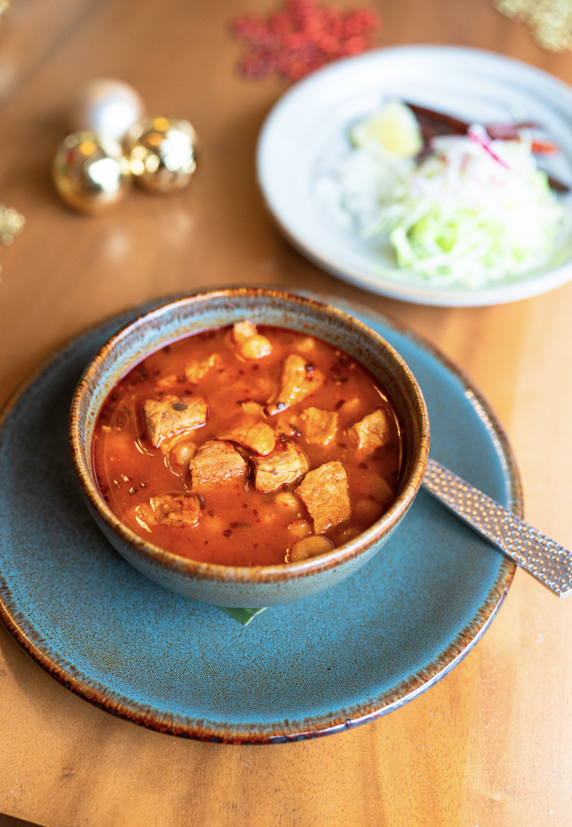 Stewed pork pozole with hominy. Seasoned with guajillo, ancho and arbol chiles. Garlic, onions, and oregano. Topped with cabbage and radishes. Served with limes, toasted arbol chiles and tostadas